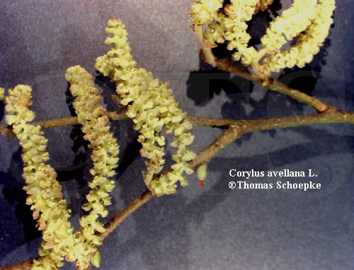 - Cultivated (inflorescence) Corylus avellana - Cultivated, at Greifswald Botanical Garden (male inflorescence) Corylus avellana - Cultivated, at Greifswald Botanical Garden (male inflorescence - close) Corylus avellana - Cultivated, at Greifswald Botanical Garden (branch in flower) Corylus avellana - Cultivated, at Greifswald Botanical Garden (branch in flower - close) Corylus avellana - Cultivated, at Greifswald Botanical Garden (female inflorescence) Corylus avellana - Cultivated, at Greifswald Botanical Garden (female inflorescence - close) Corylus avellana - Cultivated, at Greifswald Botanical Garden (female flowers) Corylus avellana - Cultivated, at Greifswald Botanical Garden (male flower) |