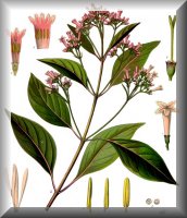 Botanische Beschreibung der Stammpflanzen: Bis etwa 25 m hohe Bäume mit gegenständigen, gestielten Blättern. Der Durchmesser der Stämme reicht bis 30 cm, die Blattspreite ist ungeteilt und ganzrandig. Umriss und Größe der Blätter variieren von Art zu Art von elliptisch-lanzettlich bis rundlich (s. Abbildungen unten) sowie von 10 x 4 cm (C. calisaya) bis 40 x 25 cm (C. pubescens). Die Blüten sind in in reichblütigen, endständigen Rispen angeordnet, die bis zu 35 cm lang sein können. Die Blüten sind radiärsymmetrisch, rot, rosa oder gelblich weiß. Der Kelch ist klein, glockenförmig und fünfzähnig, die Krone stieltellerförmig. Sie setzt sich zusammen aus einer relativ langen Röhre und fünf mehr oder weniger rechtwinkelig abstehenden, zum Teil behaarten (C. pubescens, C. ledgeriana) Kronzipfeln. Die fünf Staubblätter sind mit den Kronblättern verwachsen und nahezu in der Röhre verborgen. Der aus zwei Fruchtblättern gebildet Fruchtknoten ist unterständig und zweifächrig. Aus ihm entwickelt sich eine von unten nach der Spitze zu aufspringende Kapsel, die zahlreiche geflügelte Samen enthält. |